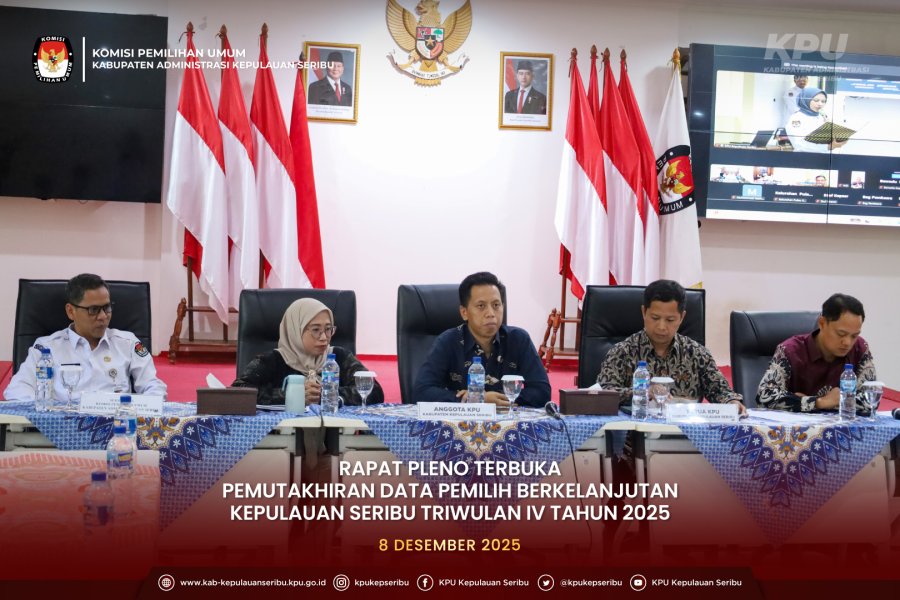 KPU Kabupaten Administrasi Kepulauan Seribu usai menggelar Rapat Pleno Terbuka Pemutakhiran Data Pemilih Berkelanjutan Tahun 2025 secara hybrid (luring dan daring) di Ruang Pola Kabupaten Administrasi Kepulauan Seribu, Pulau Pramuka pada Senin (8/12).