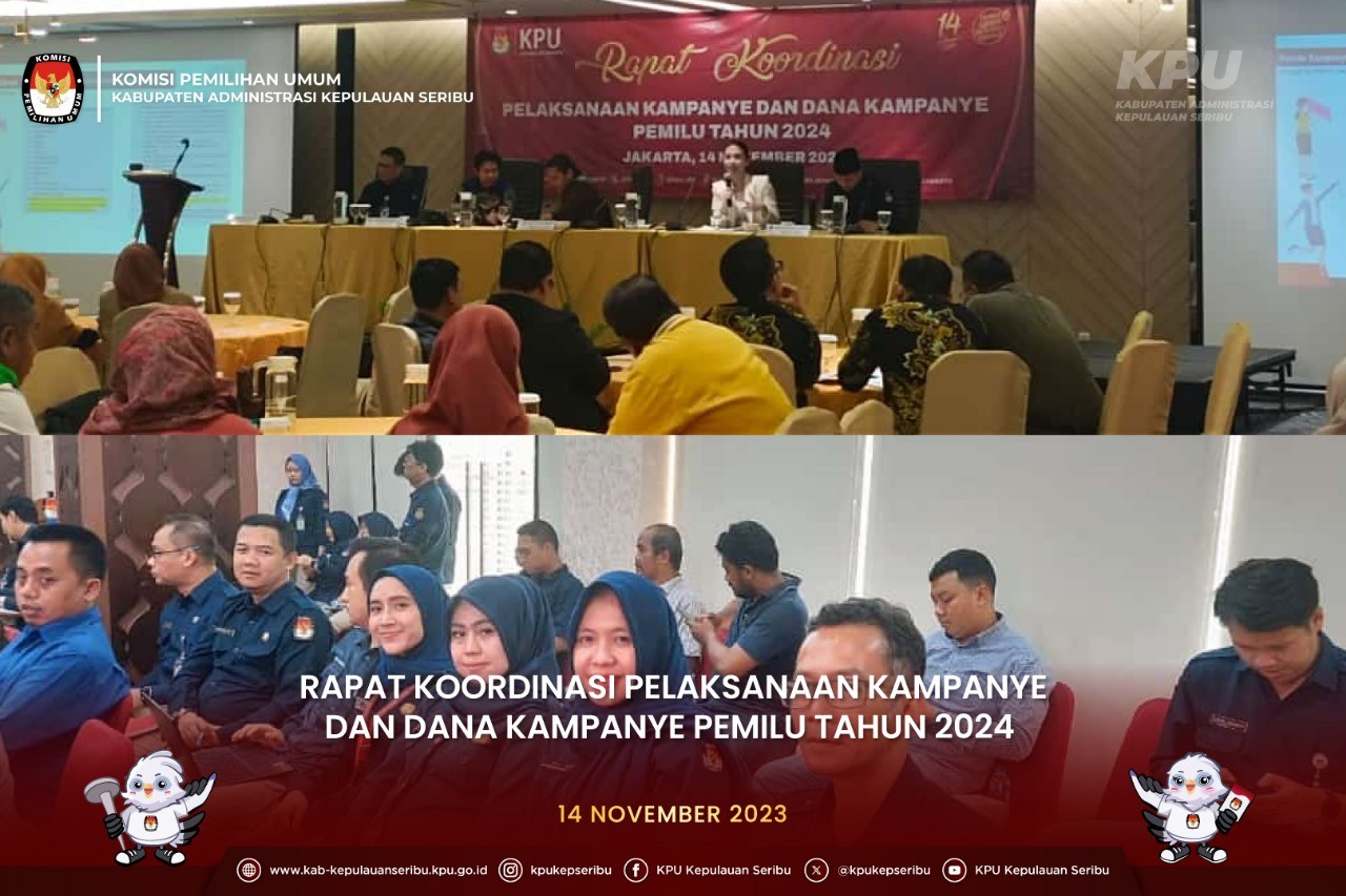 Selasa, 14 November 2023 KPU Kepulauan Seribu menghadiri Rapat Koordinasi Titik Kampanye dan Pemasangan Alat Peraga Kampanye Pemilu 2024 yang diselenggarakan oleh KPU Provinsi DKI Jakarta dan dihadiri oleh seluruh Anggota KPU Kab/Kota se-Provinsi DKI Jakarta yang membidangi Divisi Sosialisasi, Pendidikan Pemilih, Partisipasi Masyarakat dan SDM, Kasubbag Teknis Penyelenggaraan dan Parmas KPU Kab/Kota se-Provinsi DKI Jakarta serta stakeholders terkait di tingkat Provinsi DKI Jakarta.