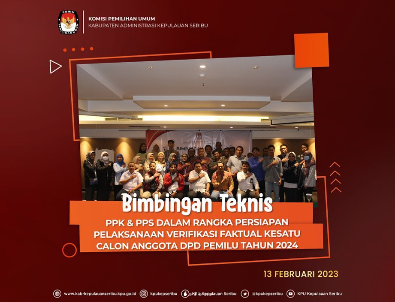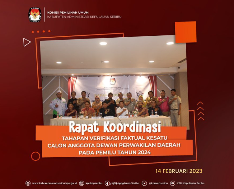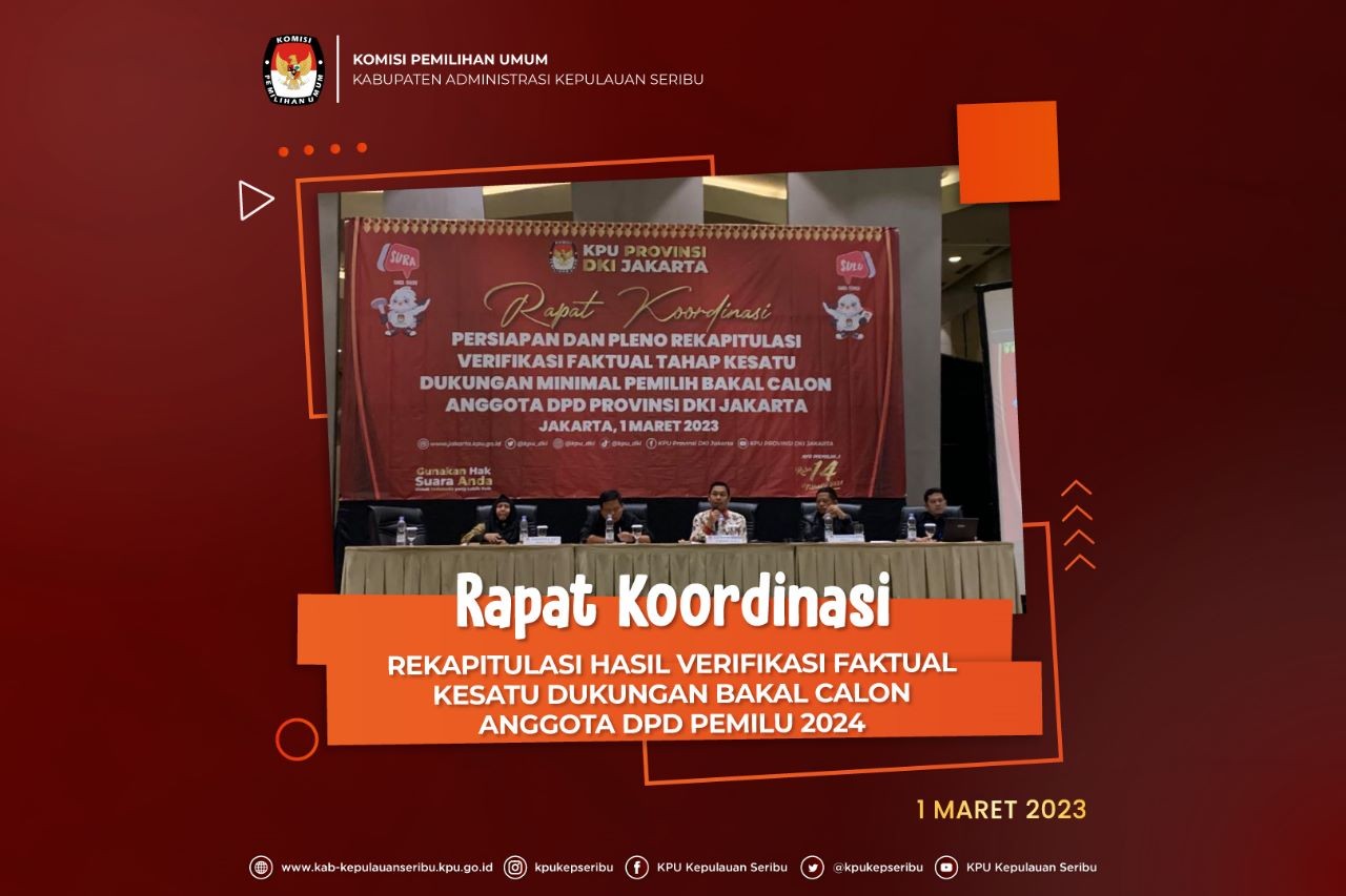 Selasa, 14 Februari 2023 KPU Kepulauan Seribu mengadakan Rapat Koordinasi Persiapan Pelaksanaan Verifikasi Faktual Pertama Calon Anggota DPD Tahun 2024 yang berlokasi di Orchardz Hotel Gunung Sahari, Jakarta Pusat. Rapat kali ini turut mengundang beberapa stakeholder yang berperan dalam membantu mendukung kegiatan verifikasi faktual pertama anggota DPD 2024. Tamu undangan rapat meliputi Bupati Kepulauan Seribu, Polres Kepulauan Seribu, Sudin Kominfotik Kepulauan Seribu, Camat dan Lurah se-Kab. Kepulauan Seribu dan Para LO Calon Anggota DPD di wilayah Kepulauan Seribu. Pada Rapat Koordinasi ini, Ketua KPU Kepulauan Seribu, Murhofik, menyampaikan Bahwa di Kepulauan Seribu terdapat 10 Bakal Calon DPD yang akan dilakukan verifikasi dukungannya antara lain adalah, Achmad Azran, Alwiyah Ahmad, Ardi Putra Baramuli, Christianto Suryowibowo, Fahira Idris, Syaifuddin, Syifa Awalia, Sylviana Murni, Ulla Nur Rachmawati, dan Zeki Andi Alatas. Materi yang Kadiv Teknis Penyelenggaraan Pemilu, Ahmad Gojali, menjelaskan tentang tahapan dan jadwal verifikasi faktual kesatu yang akan dilaksanakan pada tanggal 6 Februari hingga 26 Februari 2023. Gojali juga menambahkan bahwa respon cepat dari para LO akan sangat membantu tim verifikator lapangan dalam pelaksanaan verifikasi faktual kesatu calon anggota DPD. Pada rapat kali ini, Lurah Pulau Kelapa menyampaikan dukungannya pada pelaksanaan Verifikasi Faktual kesatu untuk calon anggota DPD. Pihaknya juga bersedia untuk turut membantu proses pelaksanaan verfak di wilayahnya. Namun, dirinya meminta untuk tidak memberikan surat pemberitahuan secara mendadak terlebih surat yang ditujukan kepada Bupati. Diakhir rapat, Kadafi, anggota KPU Kepulauan Seribu memberikan penutupnya dengan membandingkan dengan pelaksanaan pemilu tahun 2019 yang mayoritas suara tidak sah berasal dari surat suara DPD yakni sebanyak 19,02% di seluruh Indonesia. Kadafi juga meminta agar DPD mengintensifkan sosialisasi kepada masyarakat untuk tata cara mencoblos agar surat suaranya menjadi sah. Serta turut mensosialisasikan visi misi calon selain sosialisasi yang dilakukan oleh KPU.