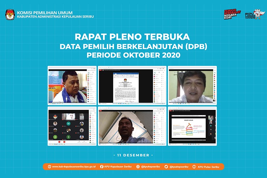 KPU Kepulauan Seribu kembali lakukan Rapat Pleno Terbuka Pemutakhiran Data Pemilih Berkelanjutan pada Jumat, 11 Desember 2020. Seperti yang telah dilaksanakan pada bulan-bulan sebelumnya, Rapat Pleno Terbuka ini dihadiri oleh Komisioner dan Sekretaris KPU Kepulauan Seribu, Anggota KPU DKI Jakarta dan pejabat stakeholder terkait di wilayah Kepulauan Seribu. Rapat pleno masih menggunakan media dari google meet karena situasi pandemi di Jakarta yang tidak memungkinkan untuk melakukan rapat tatap muka. Dalam rapat pleno, Muhaimin selaku Anggota KPU DKI Jakarta menyampaikan, setidaknya, Data Pemilih ini memenuhi 3 (tiga) kualitas data yaitu Mutakhir, Akurat dan Komprehensif. Data pemilih yang mutakhir menggambarkan kondisi terkini pemilih yang terus menerus diperbaharui untuk digunakan pada hari Pemilihan sehingga pemilih yang akan datang, data sudah valid dan realtime sehingga diperlukan peran masyarakat yang aktif. "Kita bisa buktikan khusus KPU Kabupaten Administrasi Kepulauan Seribu bahwa hubungan yang dibangun KPU bersama Stakeholder sangat baik sekali dibuktikan dengan setiap bulan Rapat Pleno Data Pemilih Berkelanjutan selalu dihadiri oleh para stakeholder dan selalu mendapat perbaharuan data sebagaimana yang dilakukan oleh KPU Kabupaten Administrasi Kepulauan Seribu." Ungkap Muhaimin. Dasar hukum dalam melakukan Pemutakhiran Data Berkelanjutan yaitu Undang-Undang nomor 7 tahun 2017 tentang Pemilu, terutama pada Pasal 204. Lalu PKPU No.2 tahun 2020 dan dikuatkan dengan SE KPU Nomor 181 tahun 2020. Kemudian ditegaskan kembali dengan Surat KPU Nomor 50 tentang Rapat Pleno dan Permintaan Data Pemilih Hasil Pemutakhiran Berkelanjutan Tahun 2020. Proses Pemutakhiran Data Berkelanjutan dimulai dari Pencermatan DPTHP-3 Pemilu 2019, melakukan pencermatan, masukan dari masyarakat dan data Konsolidasi dari Dukcapil. Hasil dari pencermatan akan ditetapkan dalam Rapat Pleno daftar pemilih berkelanjutan di bulan berikutnya. Pergerakan data tiap tahapannya yaitu pada tahap I sebanyak 19.130, tahap II 19.445, tahap III 19.512, tahap IV 19.558, tahap V 19.660, tahap VI 19.685, tahap VII 19.710, tahap VIII 19.725. Hasil Pencermatan tahap IX (bulan November) terdapat 19 (L = 10, P = 9) Pemilih Baru, dan pemilih tidak memenuhi syarat sebanyak 0 (L = 0, P = 0), Ubah data 0. Dengan pencermatan ini, Daftar Pemilih Berkelanjutan Tahap VII (Bulan September) sebanyak 19.744 (L = 9.912, P = 9.832) naik sebanyak 0,10 %. Untuk Data per-Kecamatan sampai bulan November, pada Kecamatan Kepulauan Seribu Utara sebanyak 11.576 (L = 5.828, P = 5.748) dan Kecamatan Kepulauan Seribu Selatan yaitu sebanyak 8.168 (L = 4.084, P = 4.084). Pada sesi diskusi, stakeholder yang hadir memberikan masukan terkait pemutakhiran data pemilih yang dapat dijadikan referensi untuk memperbaiki proses pemutakhiran data yang dilakukan oleh KPU Kepulauan Seribu. Rahadi Pramono selaku Plh. Ketua KPU Kepulauan Seribu menyampaikan, untuk Data Pemilih Berkelanjutan ini dimutakhirkan setiap bulan oleh KPU Kabupaten Administrasi Kepulauan Seribu dengan tujuan untuk menjadikan data pemilih menjadi lebih baik. Data pemilih tersebut akan digunakan pada pemilihan selanjutnya. Meskipun 2020 ini tidak ada pemilu, tetapi data pemilih ini akan terus dilakukan pembaharuan sehingga ketika menghadapi pemilu tidak terlalu direpotkan dengan masalah daftar pemilih karena sudah dilakukan pemutakhiran daftar pemilih secara berkelanjut