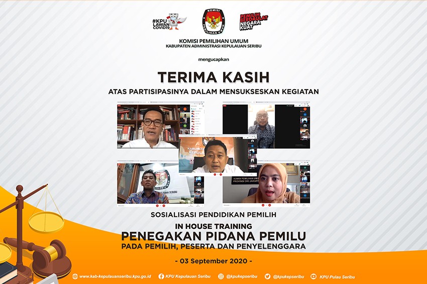 KPU Kepulauan Seribu telah selesai menyelenggarakan Sosialisasi Pendidikan Pemilih Edisi Pertama pada Kamis, 3 September 2020. Sosialisasi Pendidikan Pemilih Edisi Pertama ini mengangkat tema Penegakan Pidana Pemilu pada Pemilih, Peserta, dan Penyelenggara. Narasumber yang mengisi diskusi pada agenda ini yaitu Hasyim Asy'ari, S.H, M.Si, Ph.D (anggota KPU Republik Indonesia sekaligus Ketua Divisi Hukum) dan Dr. Refly Harun, S.H, M.H, LLM (Pakar Hukum Tata Negara dan Pengamat Politik) serta dimoderatori oleh Rustam Ibnu Rahman (Anggota KPU Kepulauan Seribu sekaligus Ketua Divisi Hukum). Sosialisasi Pendidikan Pemilih pertama ini diikuti oleh total 167 peserta dengan berbagai latar belakang, seperti pelajar, mahasiswa dari berbagai universitas, para komisinoner beserta staf sekretariat KPU dari berbagai wilayah, anggota LSM, pengurus partai politik, badan ad hoc penyelenggara pemilu, serta masyarakat umum. Komisioner dan staf Sekretariat yang mengikuti diskusi hari ini terdiri dari KPU Kabupaten/Kota dan Provinsi, diantaranya Buleleng, Kulon Progo, Simalungun, Katingan, Padang Lawas Utara, Tangerang Selatan, Sarmi, Gorontalo Utara, Bondowoso, Bolaang Mongondow, Banjarnegara, Bandung, Pasuruan, Blitar, Mimika, Kediri, Majalengka, Polewali Mandar, Bengkulu, Probolinggo dan wilayah lainnya.
