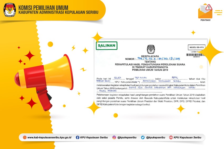 Rekapitulasi Hasil Penghitungan Suara Pemilu 2019 di tingkat Kabupaten Administrasi Kepulauan Seribu Rabu, 01 Mei 2019 00:00 346 Rekapitulasi Hasil Penghitungan Suara Pemilu 2019 di tingkat Kabupaten Administrasi Kepulauan Seribu. Unduh File Disini Baca Selengkapnya