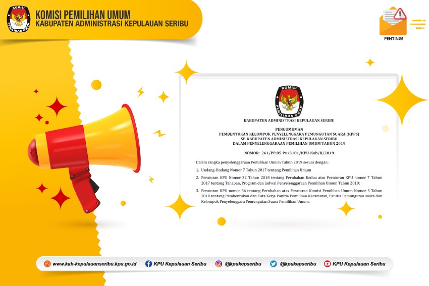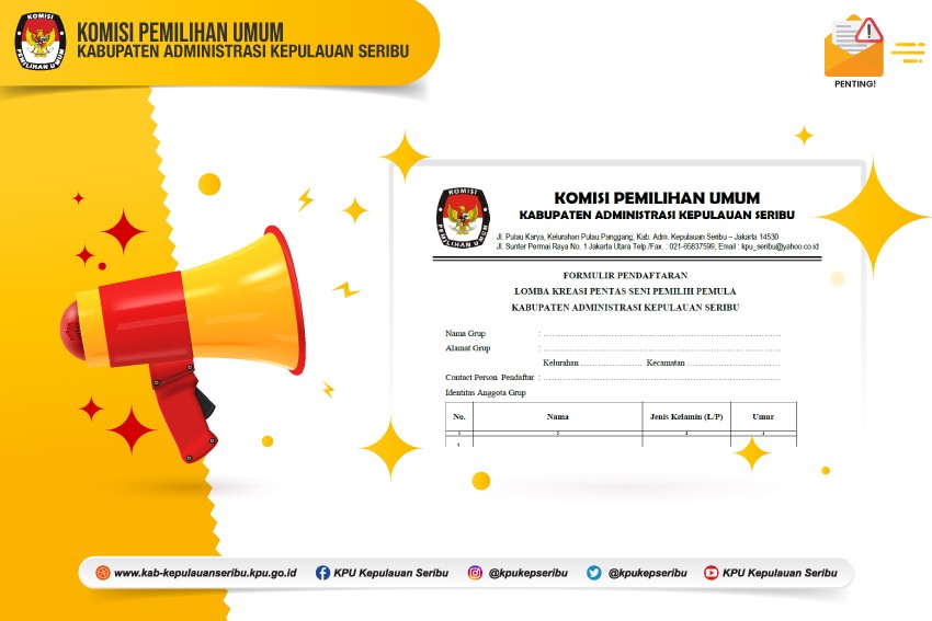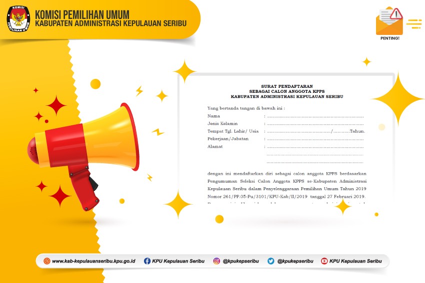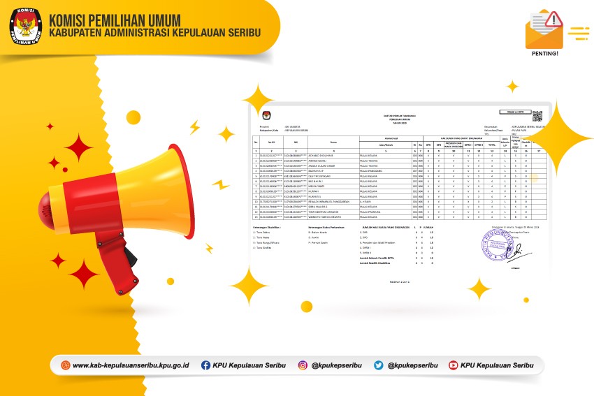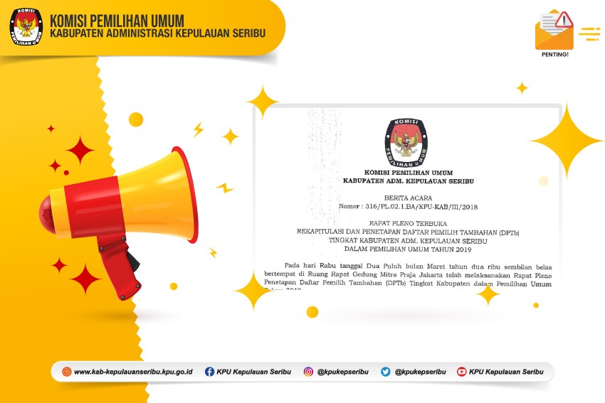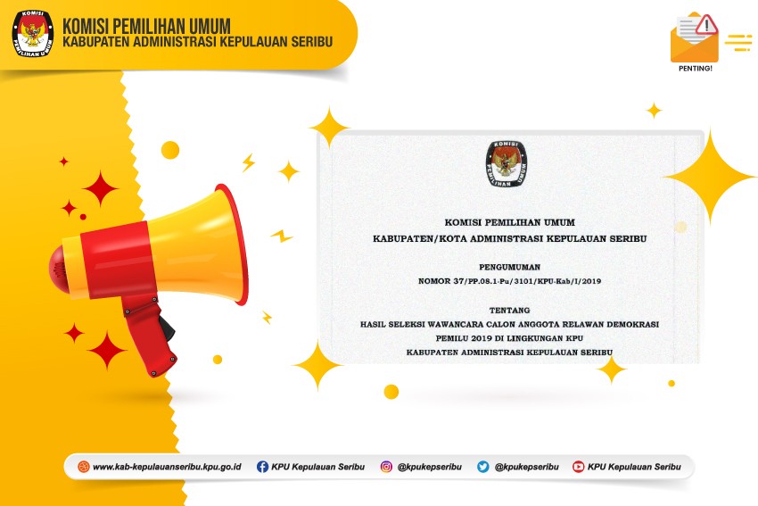 Berdasarkan hasil seleksi Administrasi dan Berita Acara Rapat Pleno KPU Kabupaten/Kota Nomor : 53/PP.0801-BA/3101/KPU-Kab/I/2019 tanggal 14 Januari 2019 serta seleksi Wawancara tanggal 15 Januari 2019, bersama ini KPU Kabupaten Administrasi Kepulauan Seribu menetapkan nama-nama peserta yang LULUS seleksi Administrasi sebagai Relawan Demokrasi yang selanjutnya akan mengikuti pelantikan pada: