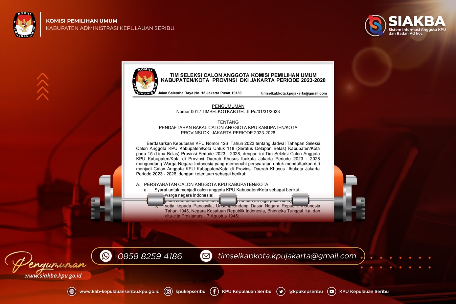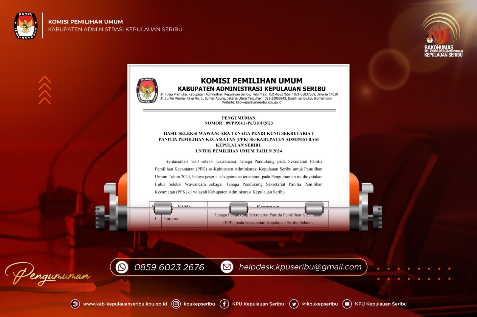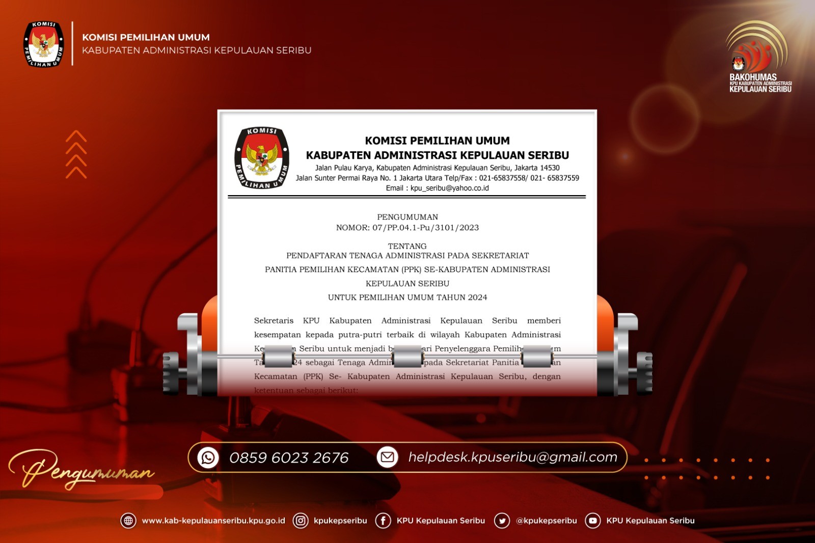 #TemanPemilih, KPU Kabupaten Administrasi Kepulauan Seribu memberikan kesempatan kepada putra putri terbaik di wilayah Kabupaten Administrasi Kepulauan Seribu untuk menjadi bagian dari penyelenggara Pemilu Serentak 2024 sebagai Tenaga Administrasi pada Sekretariat Panitia Pemilihan Kecamatan (PPK) se-Kabupaten Administrasi Kepulauan Seribu.